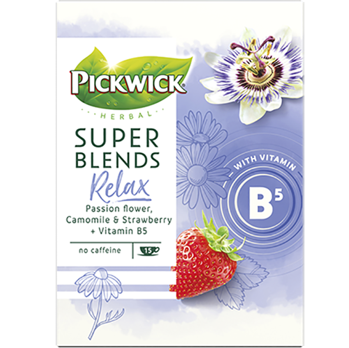 Naast Pickwick Super Blends Positivity zijn er ook vier Super Blends varianten op basis van kruiden: Immunity, Energy, Relax en Shine. Deze vier verrassende kruidentheeën bevatten geen cafeïne en zijn verrijkt met vitamines. Zo bevat Pickwick Super Blends Shine vitamine B8 (biotine), dat de conditie van je huid en haar ondersteunt. Pickwick Super Blends Immunity is verrijkt met vitamine C die bijdraagt aan de normale werking van het immuunsysteem. Met Pickwick Super Blends Energy kom jij de dag energiek door dankzij de toegevoegde B6, dat het energieniveau ondersteunt. Pickwick Super Blends Relax is een heerlijke kruidenblend met een licht fruitige smaak van aardbei, milde passiebloem en bloemige kamille. De toegevoegde vitamine B5 in deze variant ondersteunt de normale weerstand tegen stress.